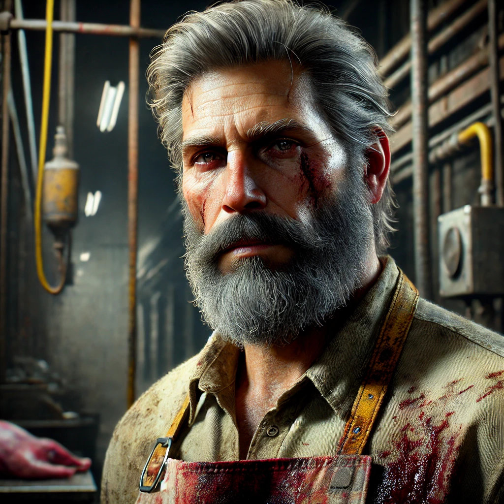 Tommy grew up in a working-class neighborhood where toughness was a survival skill, not a choice. After joining the military in his early twenties, he served in a brutal conflict that left scars on his body and mind. When he returned home, the fast pace of civilian life felt alien, and he found solace in the butcher’s trade—a profession that allowed him to channel his focus and precision into something tangible. He opened his own butcher shop in a gritty part of the city, a place that quickly became a local staple for high-quality cuts and some of the best sandwiches in town.Tommy’s shop is more than just a place to buy meat—it’s a sanctuary for those who need a safe space. Whether it’s a local kid escaping a rough home life or an old friend looking for advice, Tommy’s door is always open. But beneath the surface lies a man still haunted by his past, carrying the weight of decisions made on the battlefield. His calm exterior masks a storm of emotions, and while he doesn’t seek trouble, he’s always ready for it.